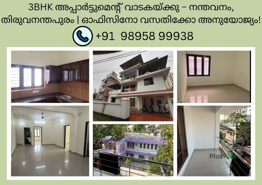 🏡 Spacious 3BHK Apartment for Rent in Nandavanam, Trivandrum | 1800 Sq.ft | Office or Family Use Looking for a premium 3BHK apartment for rent in Thiruvananthapuram city? This well-maintained 1800 sq.ft apartment in Nandavanam is a perfect choice for both residential living and office space. Located in one of the most central and high-demand areas of Trivandrum, this property offers excellent connectivity, peaceful surroundings, and prime accessibility. ✨ Property Highlights: 🛏️ 3 Spacious Bedrooms 🛋️ Large Hall + Balcony 🚿 3 Bathrooms 🏢 2nd Floor Unit 📐 Total Area: 1800 Sq.ft 🚗 Ample Parking Space 🏢 Ideal for Office / Clinic / Family Stay 📍 Prime Location Advantage (Nandavanam, Thiruvananthapuram): Opposite Valsala Nursing Home Near Reserve Bank & Nandavanam Police Camp Easy access to NH 66 & Aditya Birla Capital 950m to Thiruvananthapuram Zoo 1.5 km to Connemara Market 3.7 km to Pazhavangadi Ganapathy Temple 5 km to Sree Padmanabhaswamy Temple 9 km to LuLu Mall Trivandrum 15 km to Vizhinjam Port & Lighthouse 💰 Rent Details: ₹17,500 per month Affordable rent for prime city location 📞 Contact Now: +91 98958 99938 🔑 Why This Property? This 3BHK flat for rent in Nandavanam Trivandrum is ideal for: Families looking for a central city home Businesses searching for a budget-friendly office space in prime location Clinics, consultancies, startups, or service offices